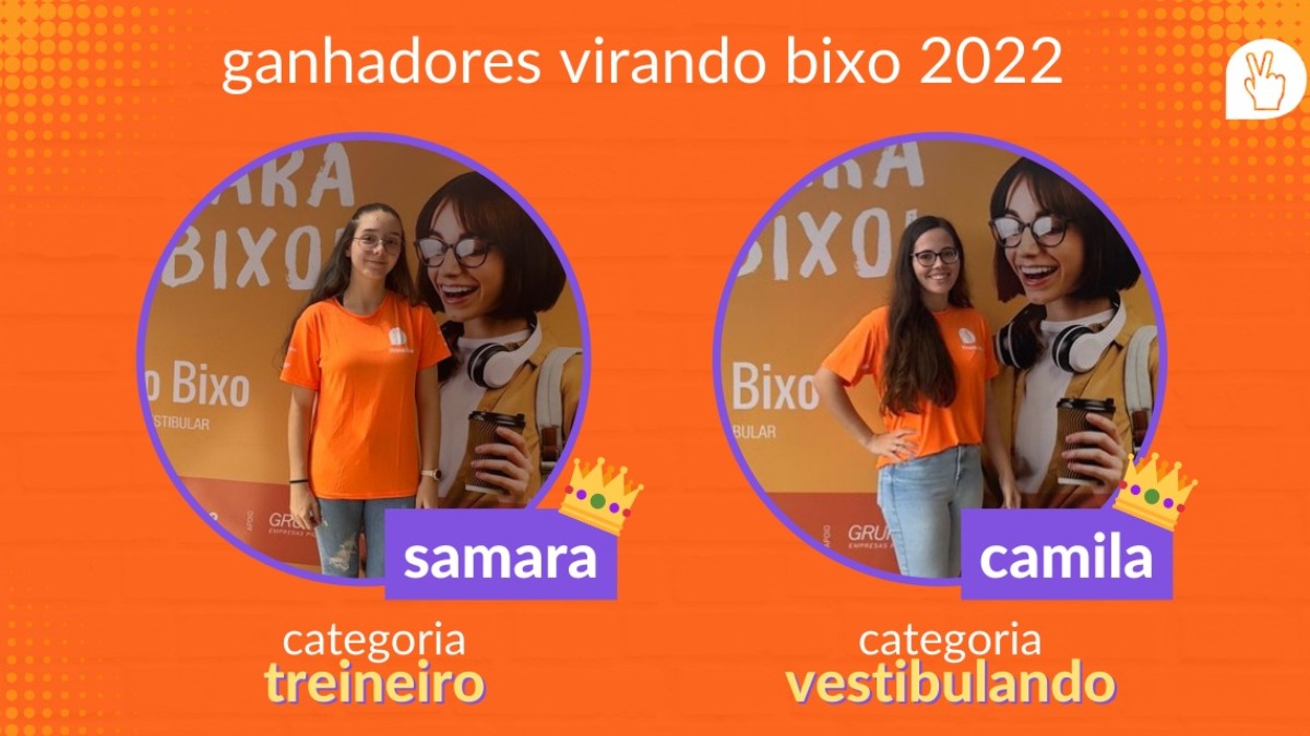 As vencedoras do Virando Bixo 2022 receberão prêmios pelo desempenho no simulado As mulheres dominaram o simulado Virando Bixo 2022: Camila Francischetti, de 21 anos, é a vencedora da categoria Vestibulando e Samara Hermínia Pagan Rodrigues, de 16, é a primeira colocada na categoria Treineiro.